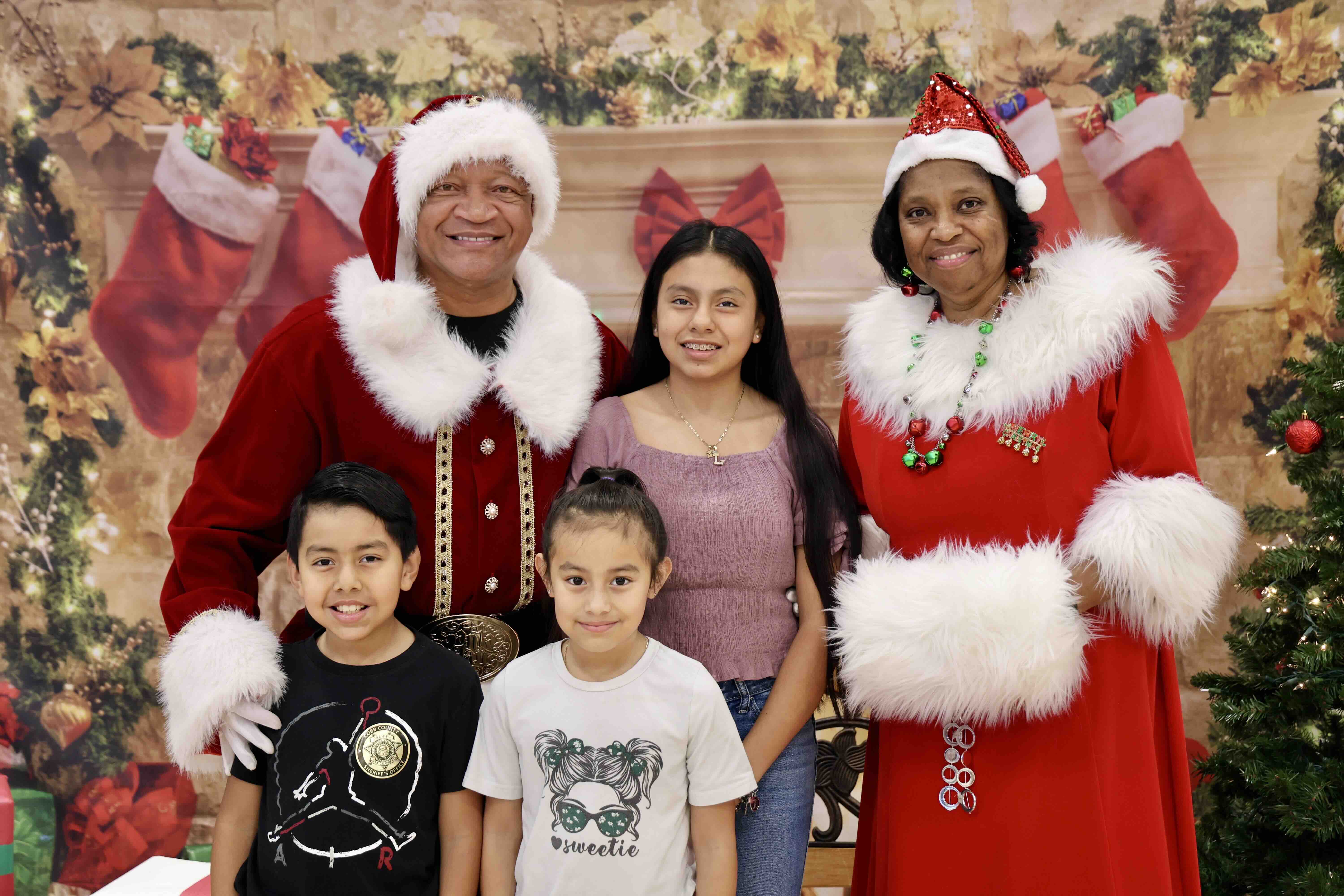 Students pose with Sheriff Owens as Santa Claus and Mrs. Owens as Mrs. Claus during the 2025 Santa on Wheels event.