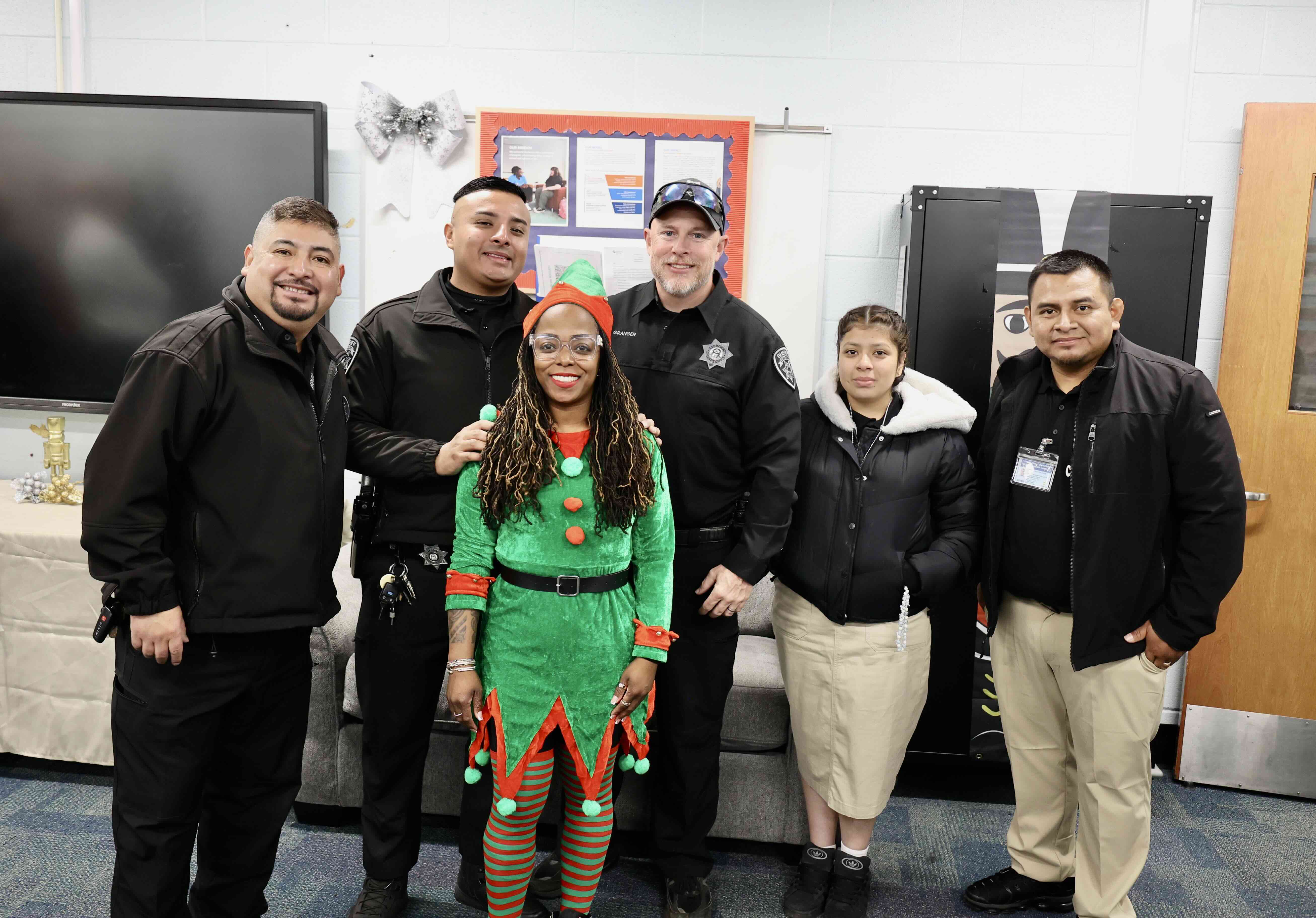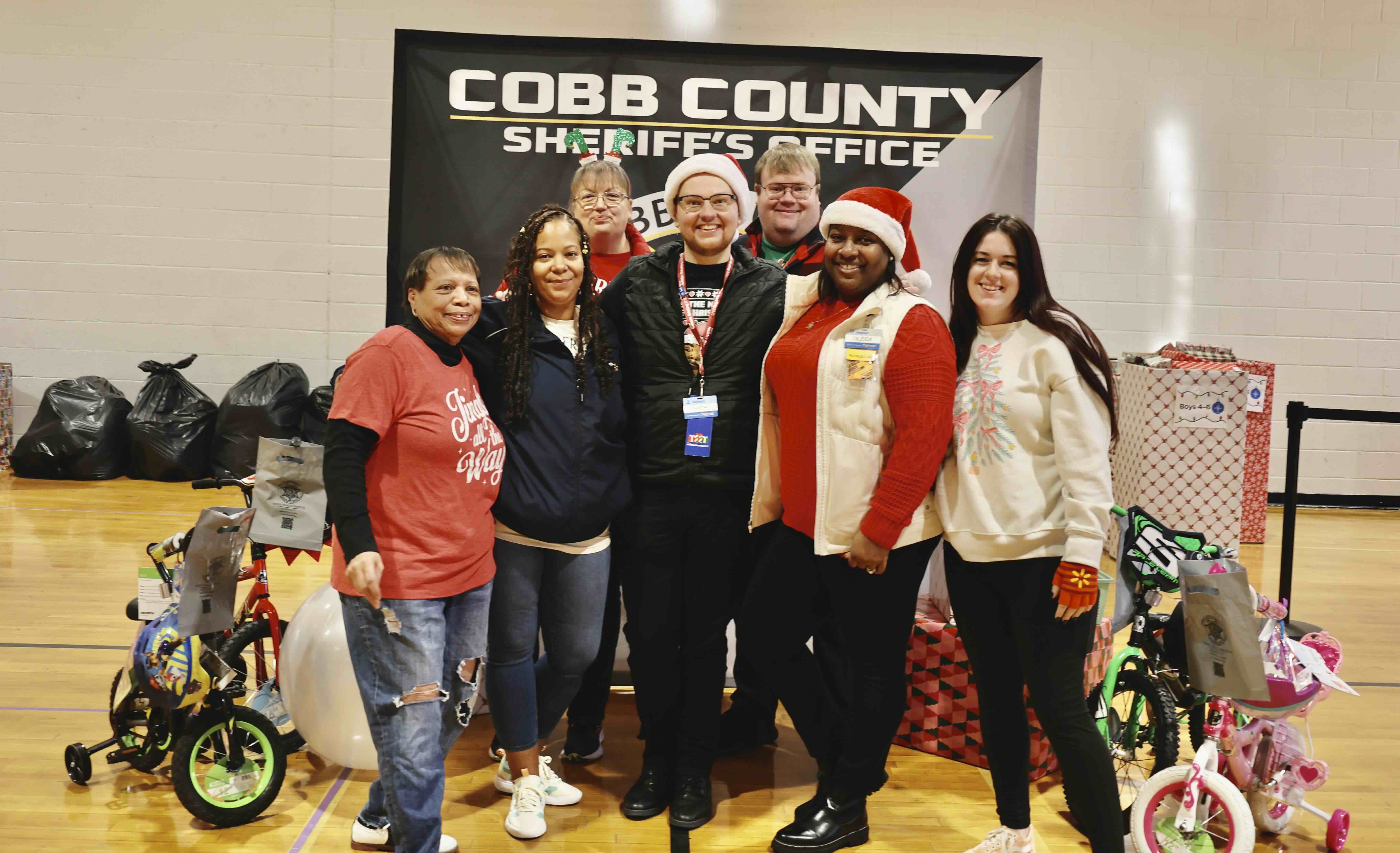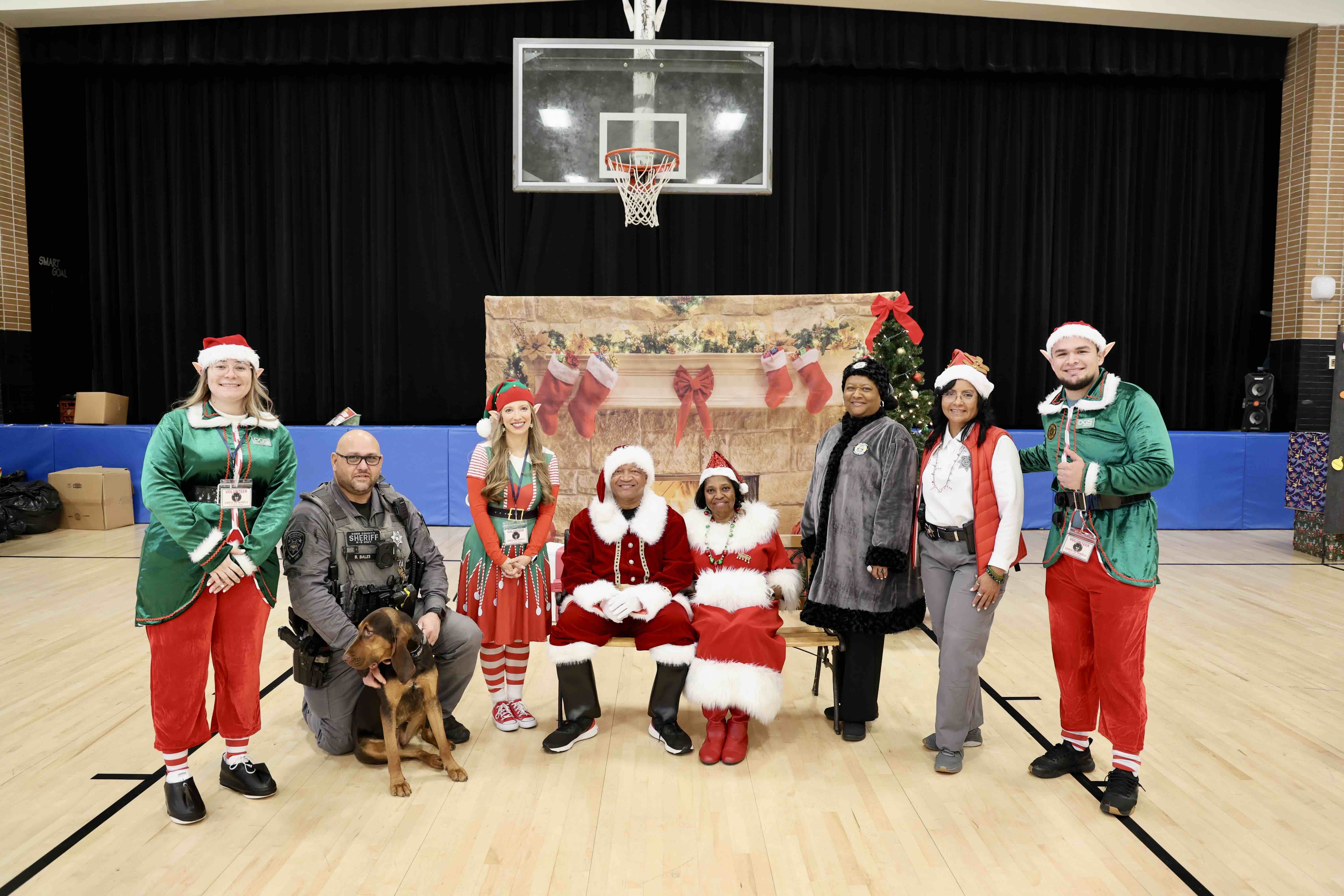 Members of the Cobb County Sheriff’s Office Community Engagement team and volunteers pose with Lt. Lolita Jones, who dressed as an elf, during the 2025 Santa on Wheels event.