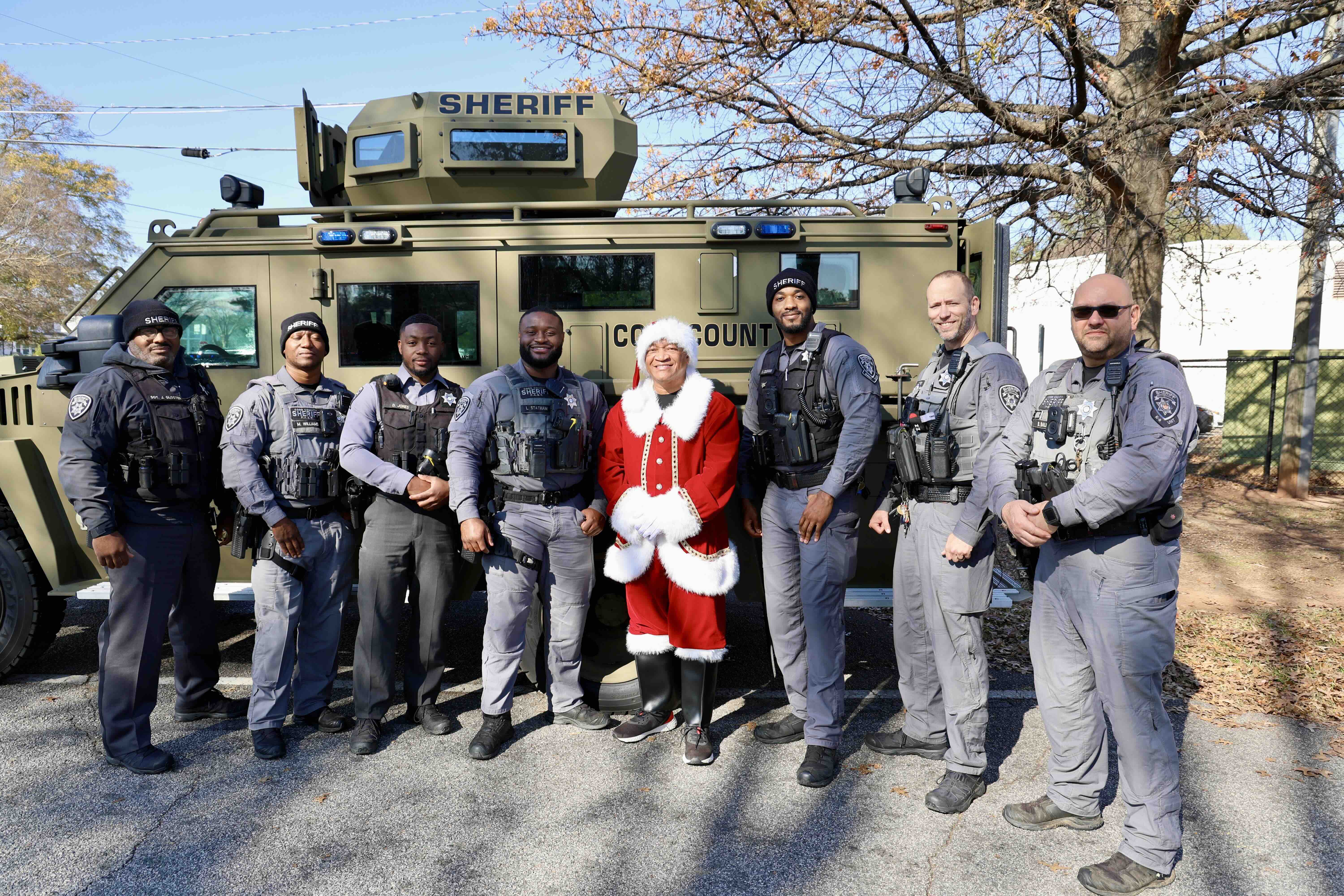 Sheriff Owens joins the SWAT team for a photo while spreading holiday cheer at the 2025 Santa on Wheels celebration.
