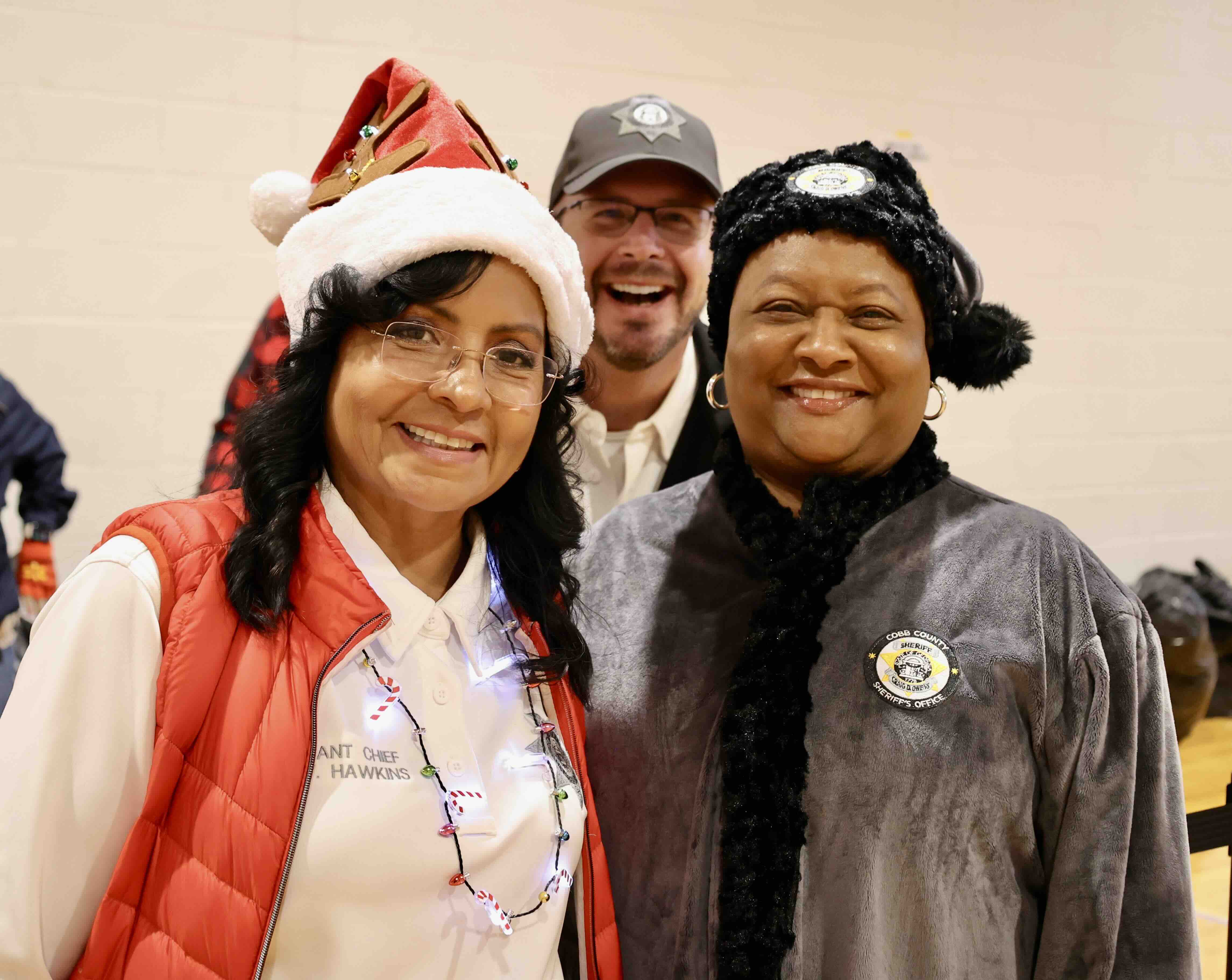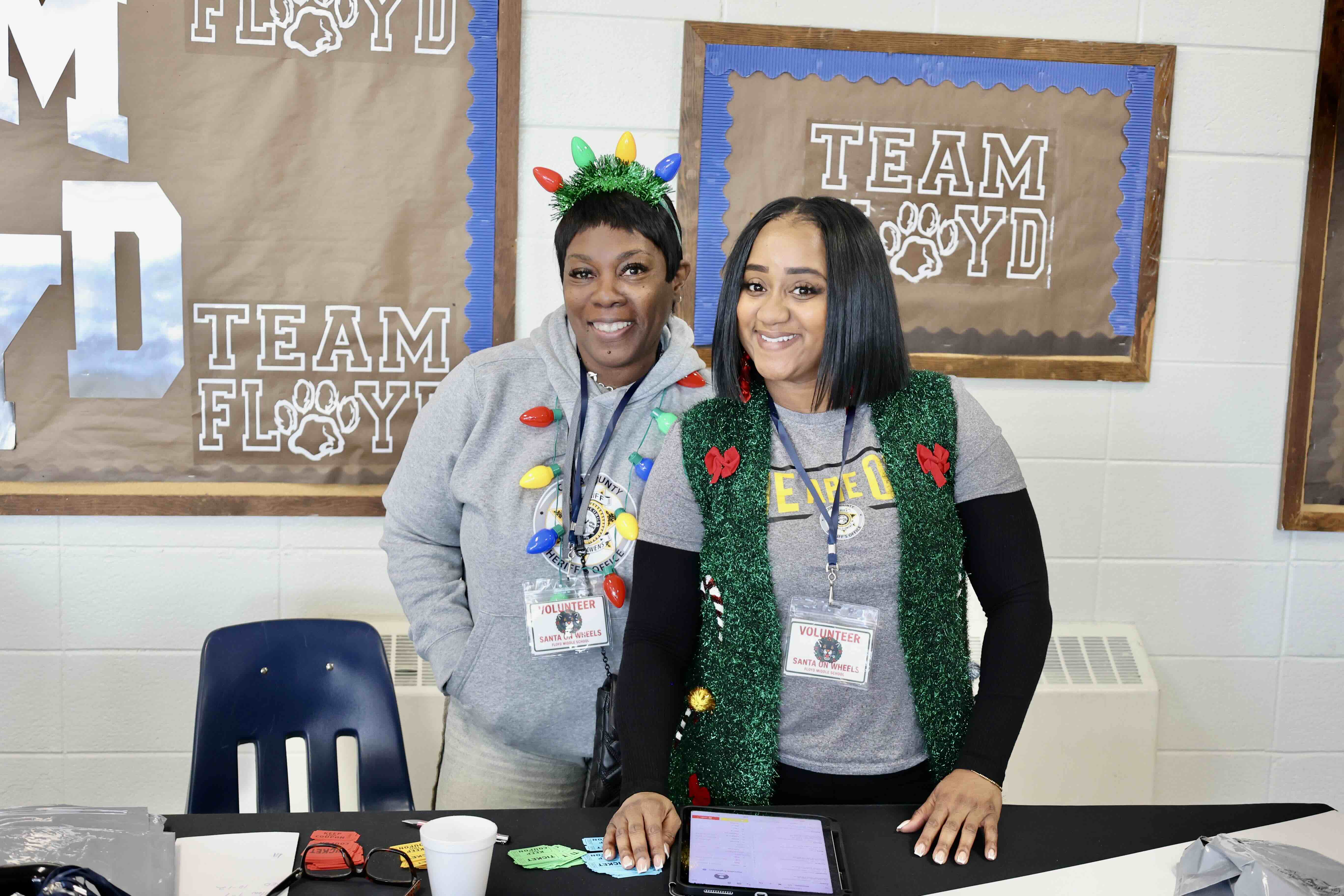 Civilian staff, Tonya Smith and Randi Okray from the Cobb County Sheriff’s Office greet attendees and pose at the registration table during the 2025 Santa on Wheels event.