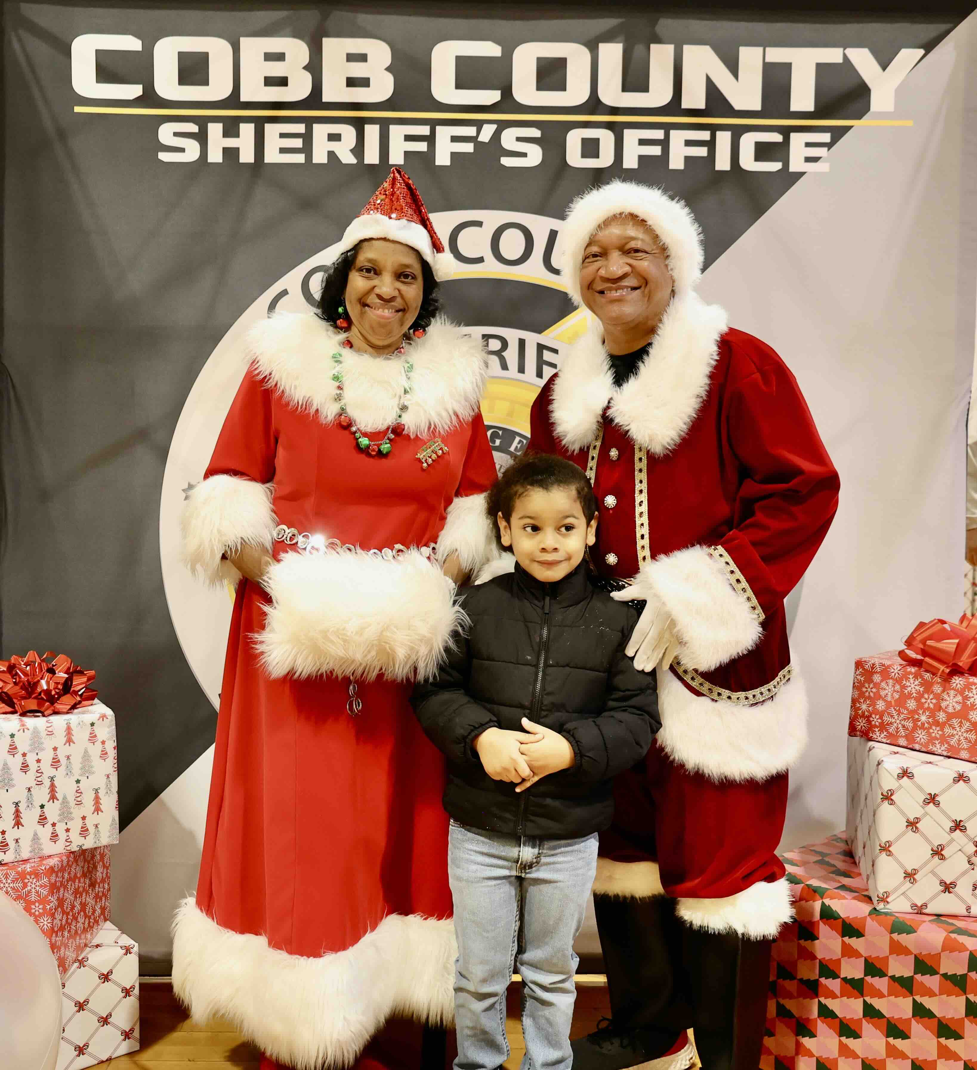 Santa Claus (Sheriff Owens) and Mrs. Claus (Mrs. Sharon Owens) pose with a student during the 2025 Santa on Wheels event.