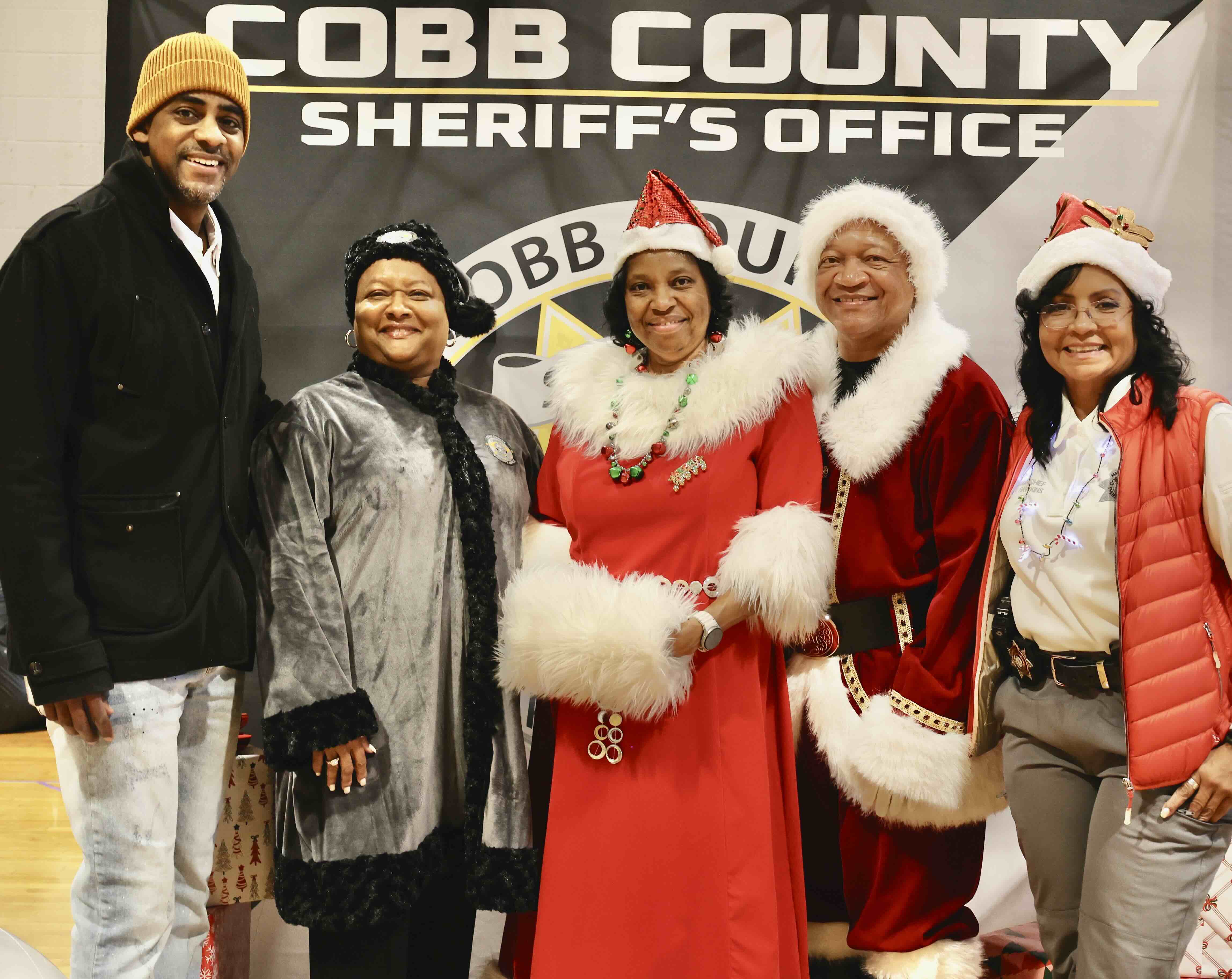 Sheriff Craig Owens, his wife Sharon Owens, Santa on Wheels team members, and Cobb County Sheriff’s Office employees share smiles during the 2025 Annual Santa on Wheels Toy Drive Giveaway.