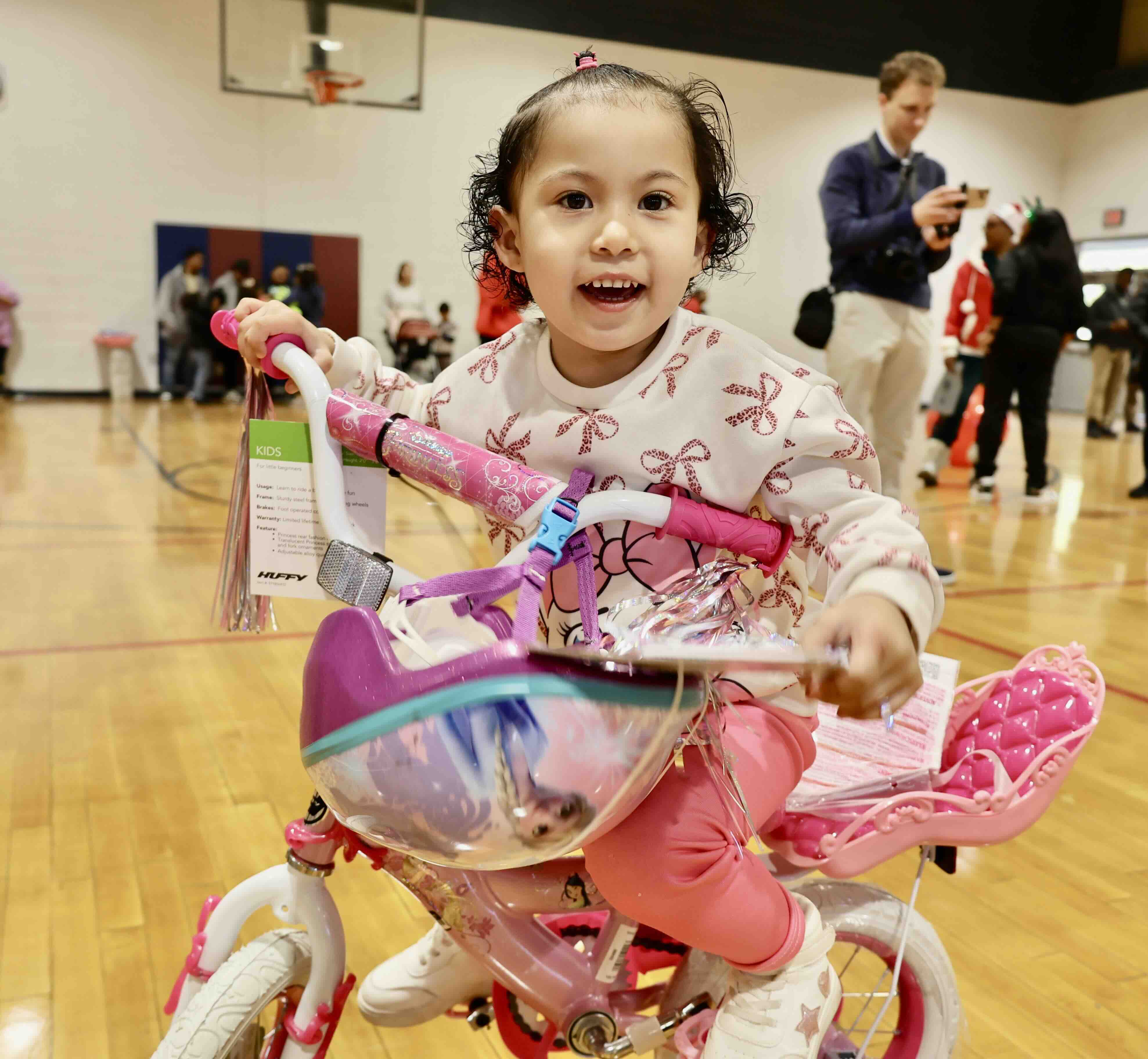 A smiling student takes a ride on the bike she won in the raffle during the 2025 Santa on Wheels celebration.