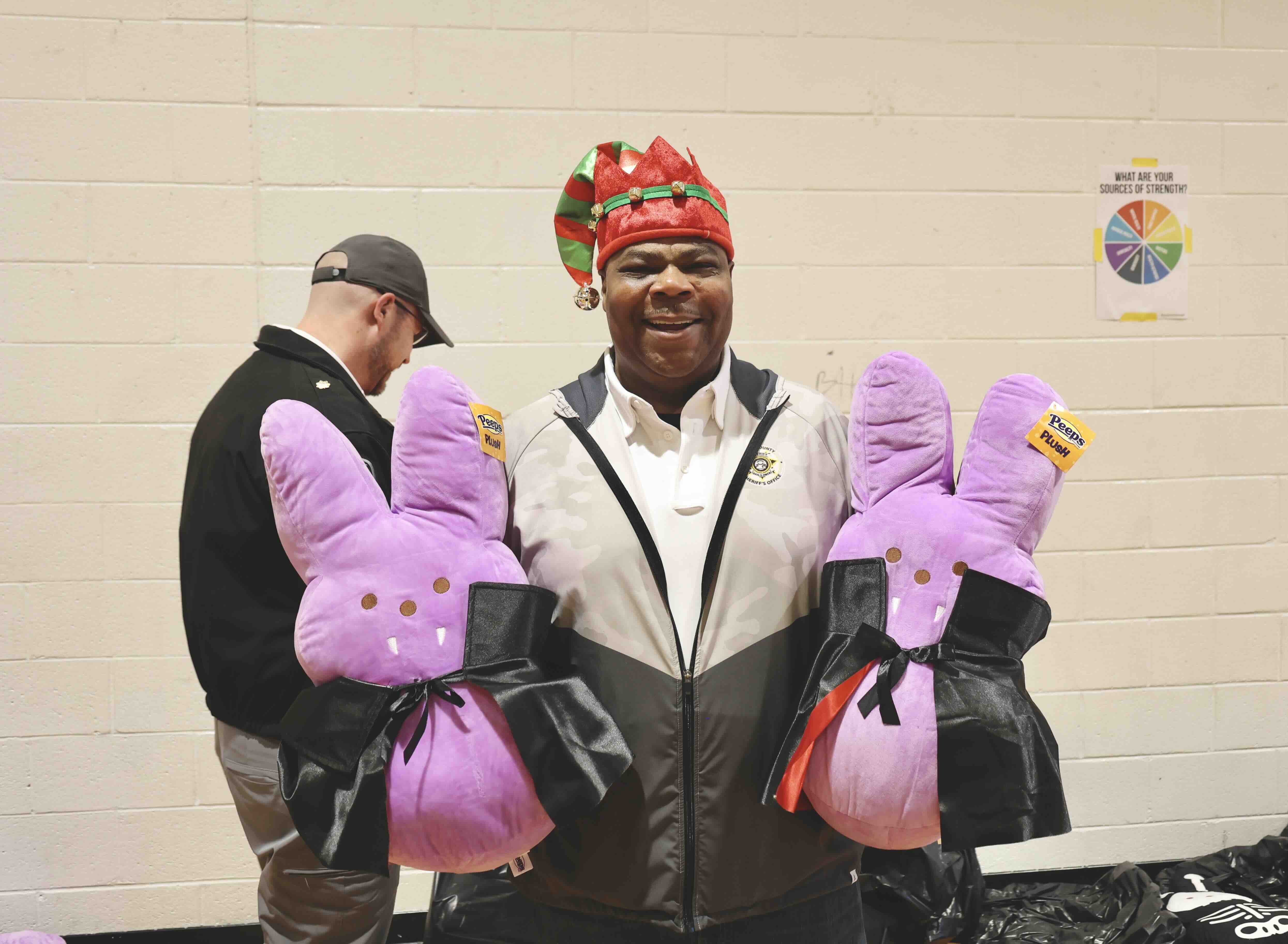 Col. Michael A. Williams helps showcase the toys collected for students during the 2025 Santa on Wheels event.