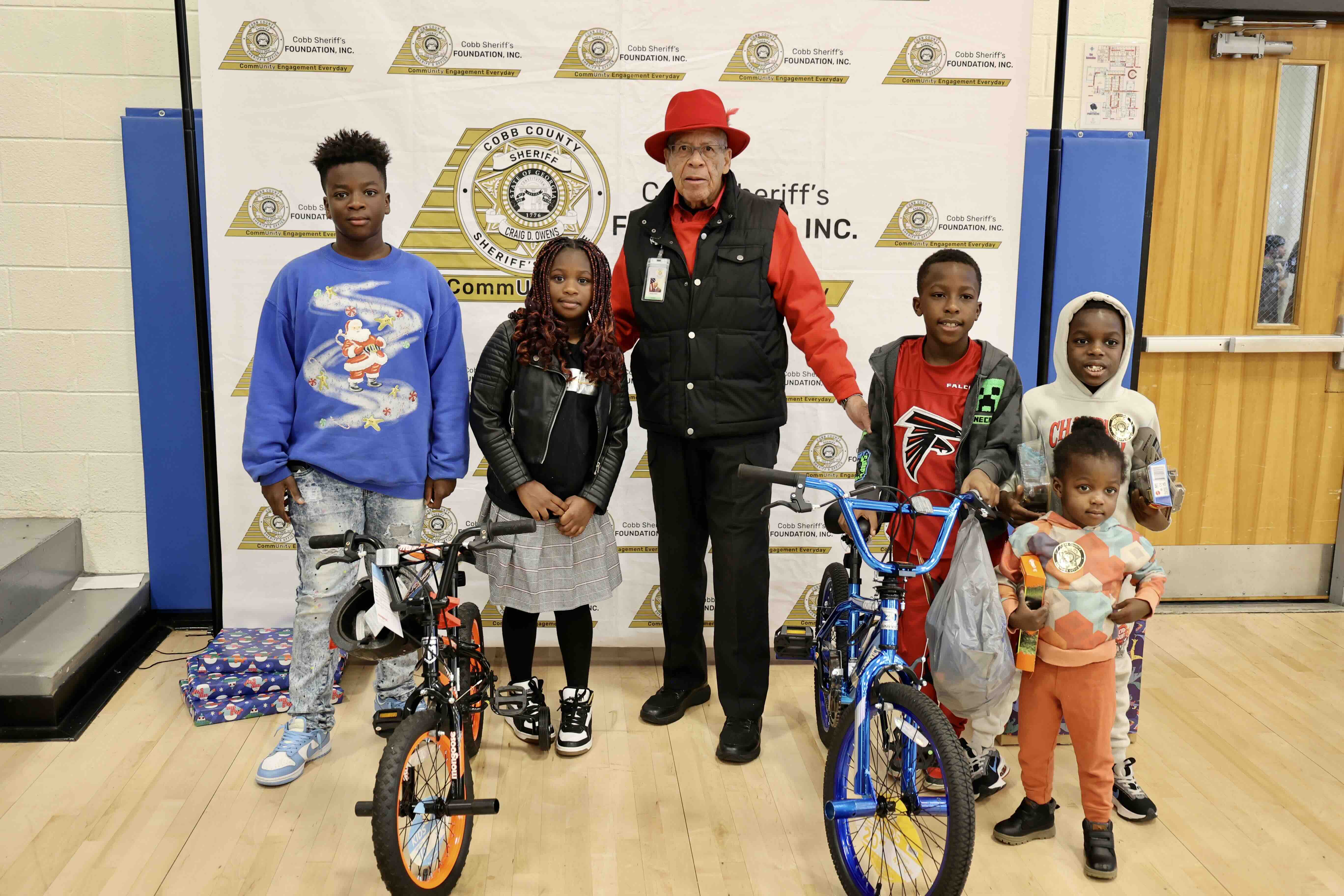 Bike raffle winners celebrate with Mr. Robert Haley, founder and executive director of the Cobb Sheriff’s Foundation, at the 2025 Santa on Wheels event.