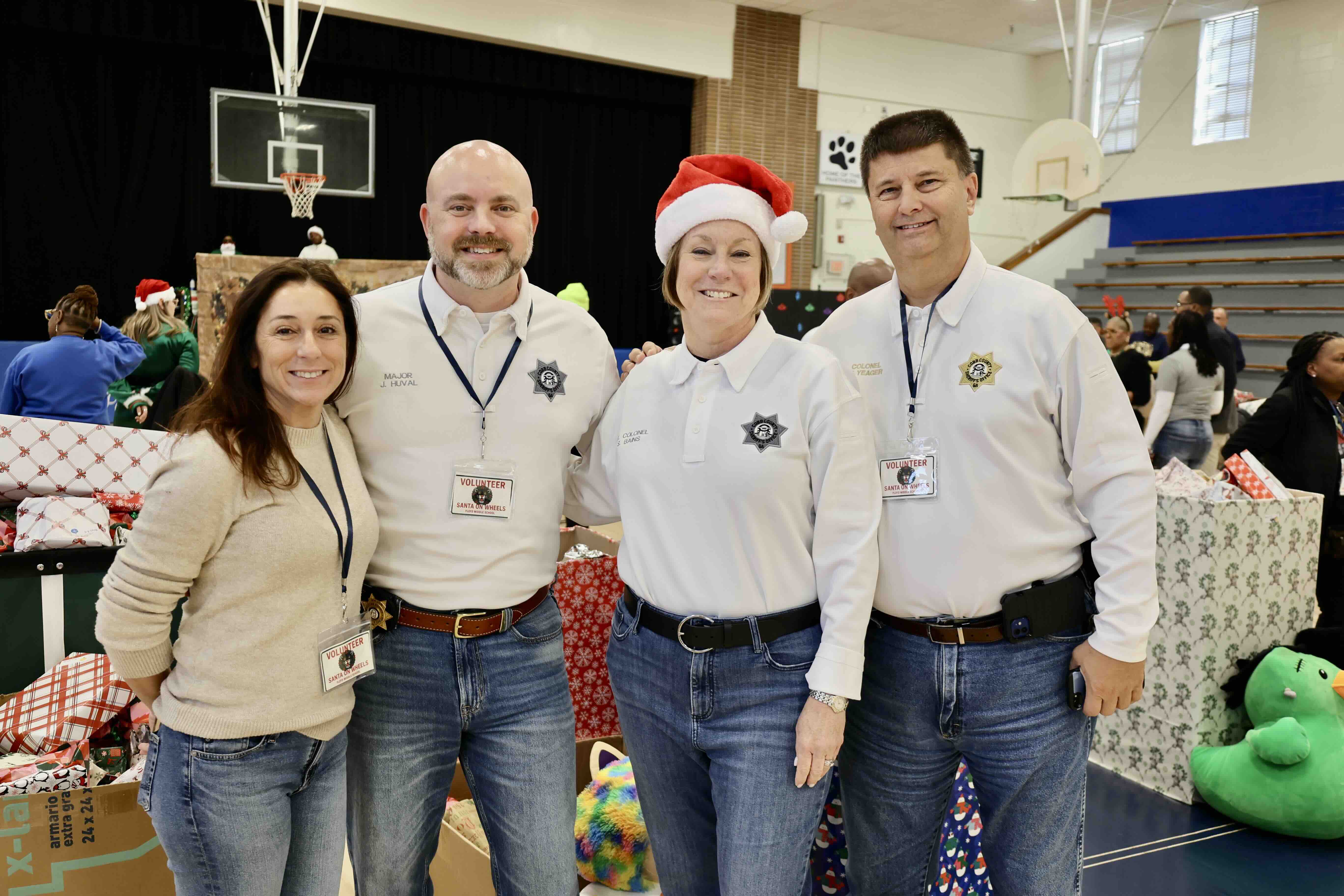 Walmart volunteers partner with the Cobb County Sheriff’s Office to distribute toys at Lindley Middle School during the 2025 Santa on Wheels event.