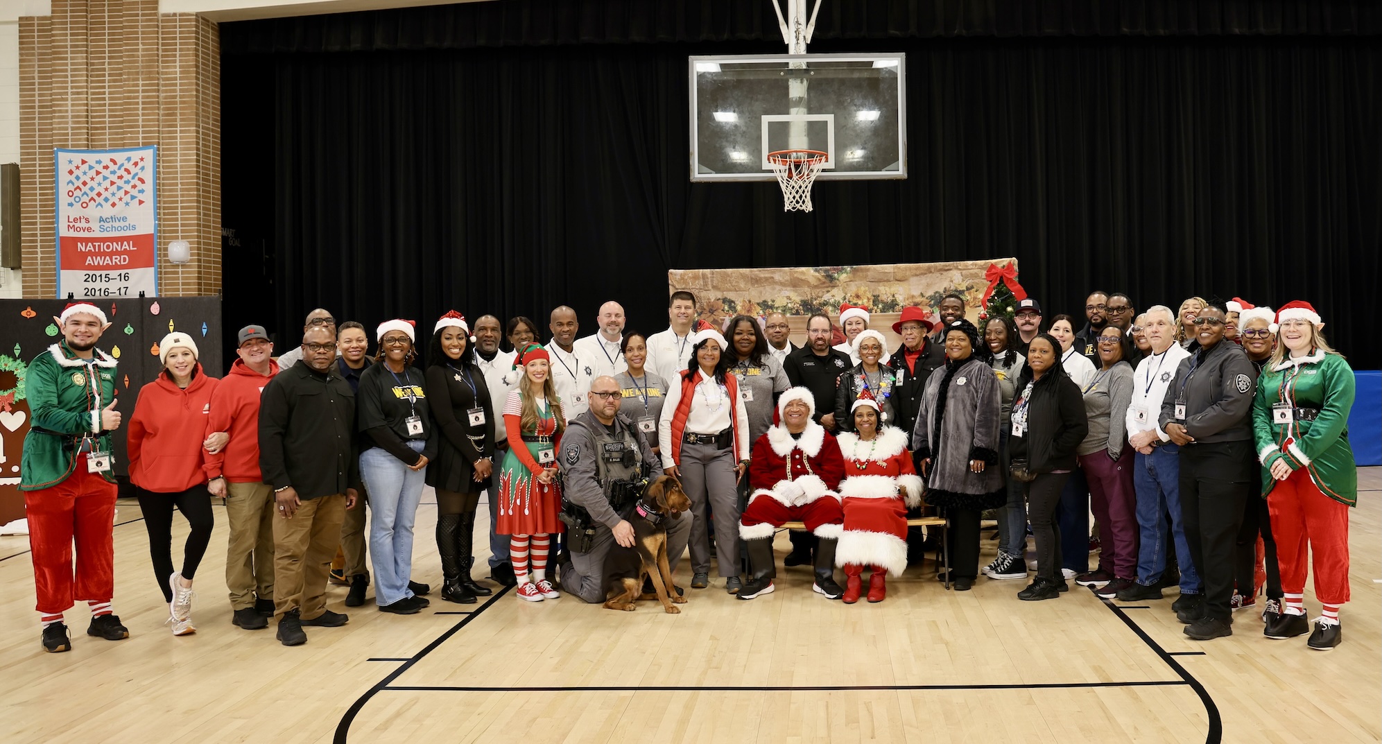 Santa and Mrs. Claus join their team of elves, Deputy Bales with K-9 Liberty, and sheriff office leaders Asst. Chief Hawkins and Chief Anderson for a group photo at the 2025 Santa on Wheels event.