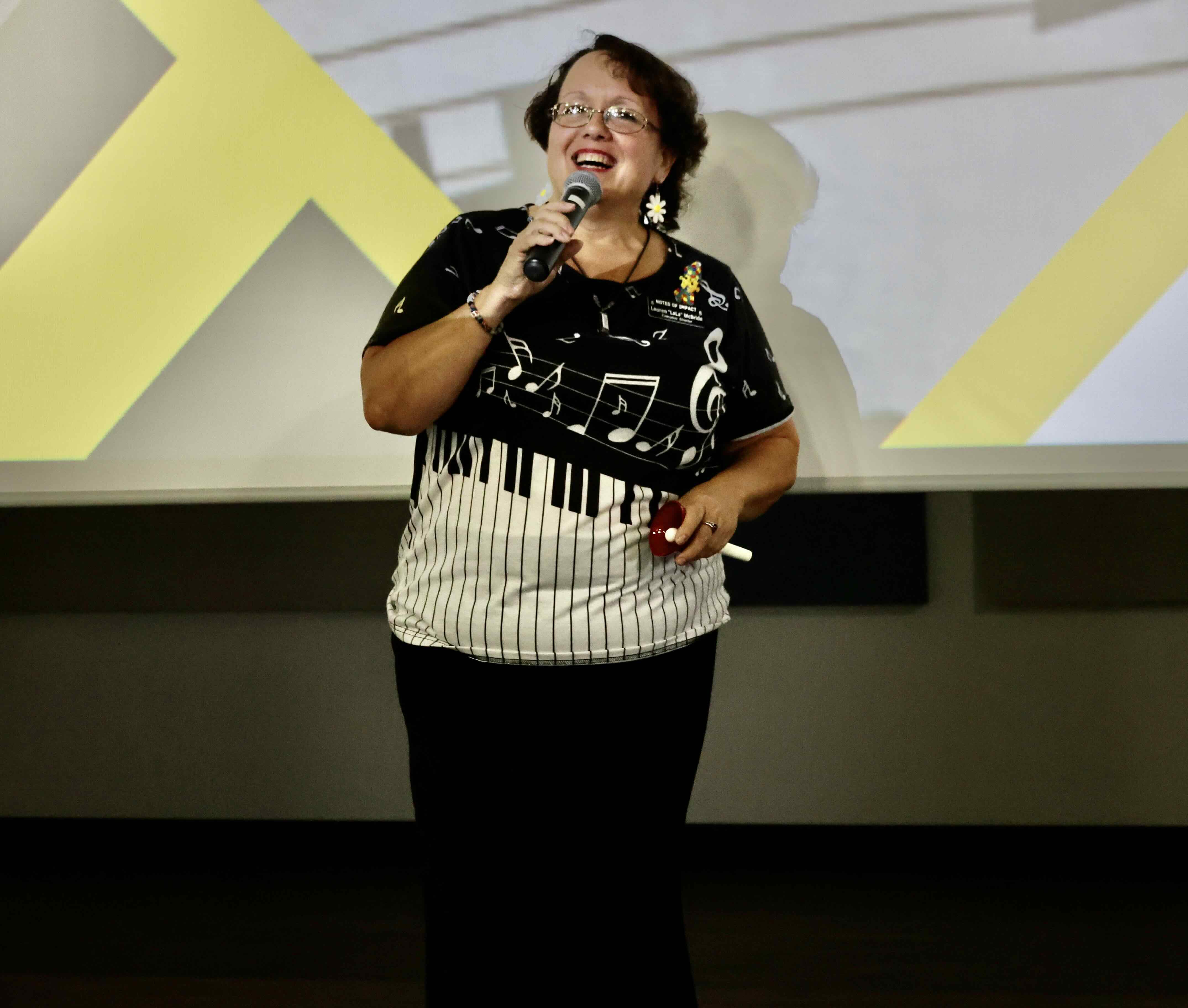 Lauren "LaLa" McBride, founding executive director of Notes of Impact Inc., goes over the rules for her presentation at the September 2025 Community Briefing.