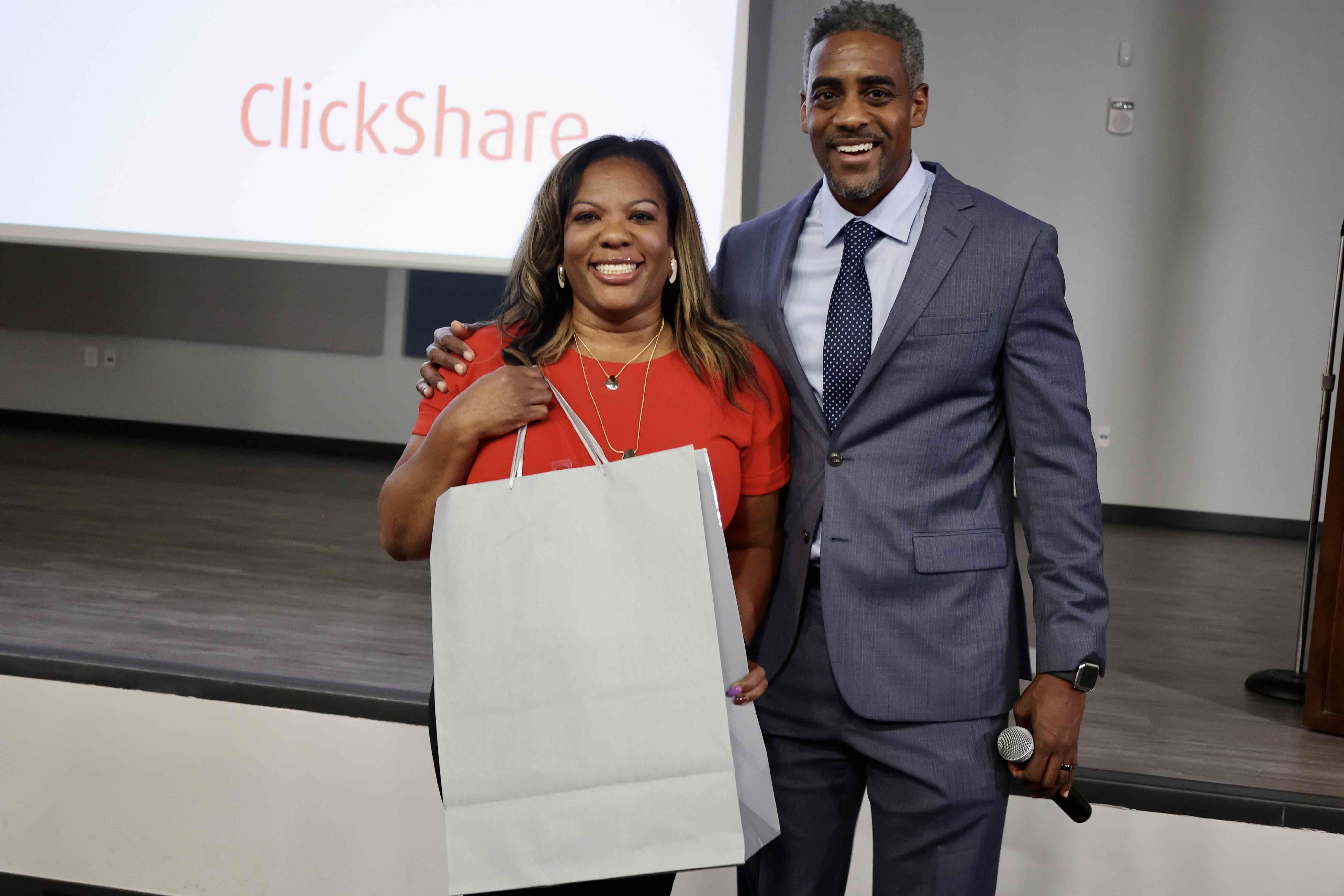 Chief Jones poses with a raffle winner and Citizens Academy alum at the September 2025 Community Briefing.