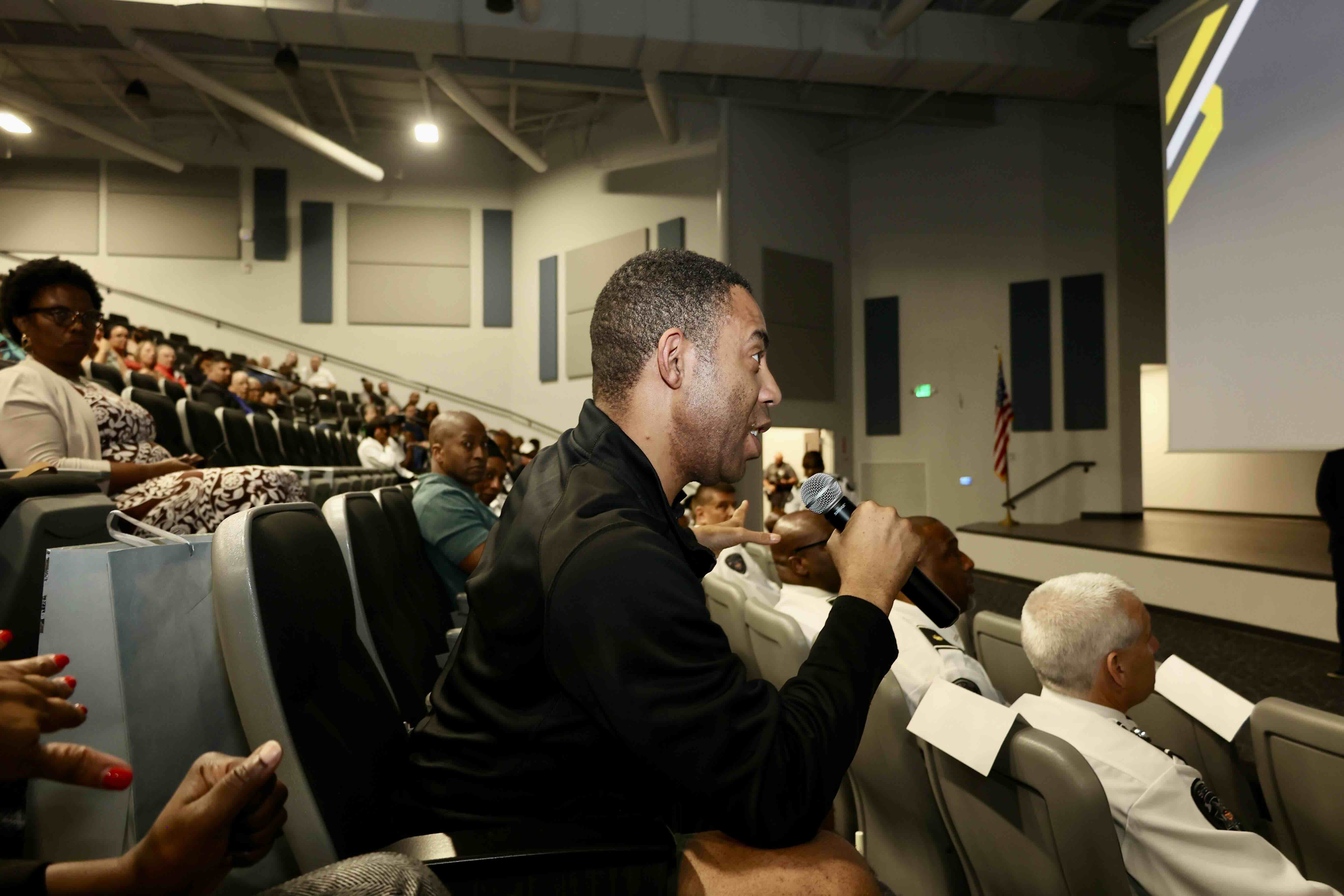 An attendee asks Sheriff Owens if the new renovations will affect job hiring as he considers becoming a deputy during the September 2025 Community Briefing.