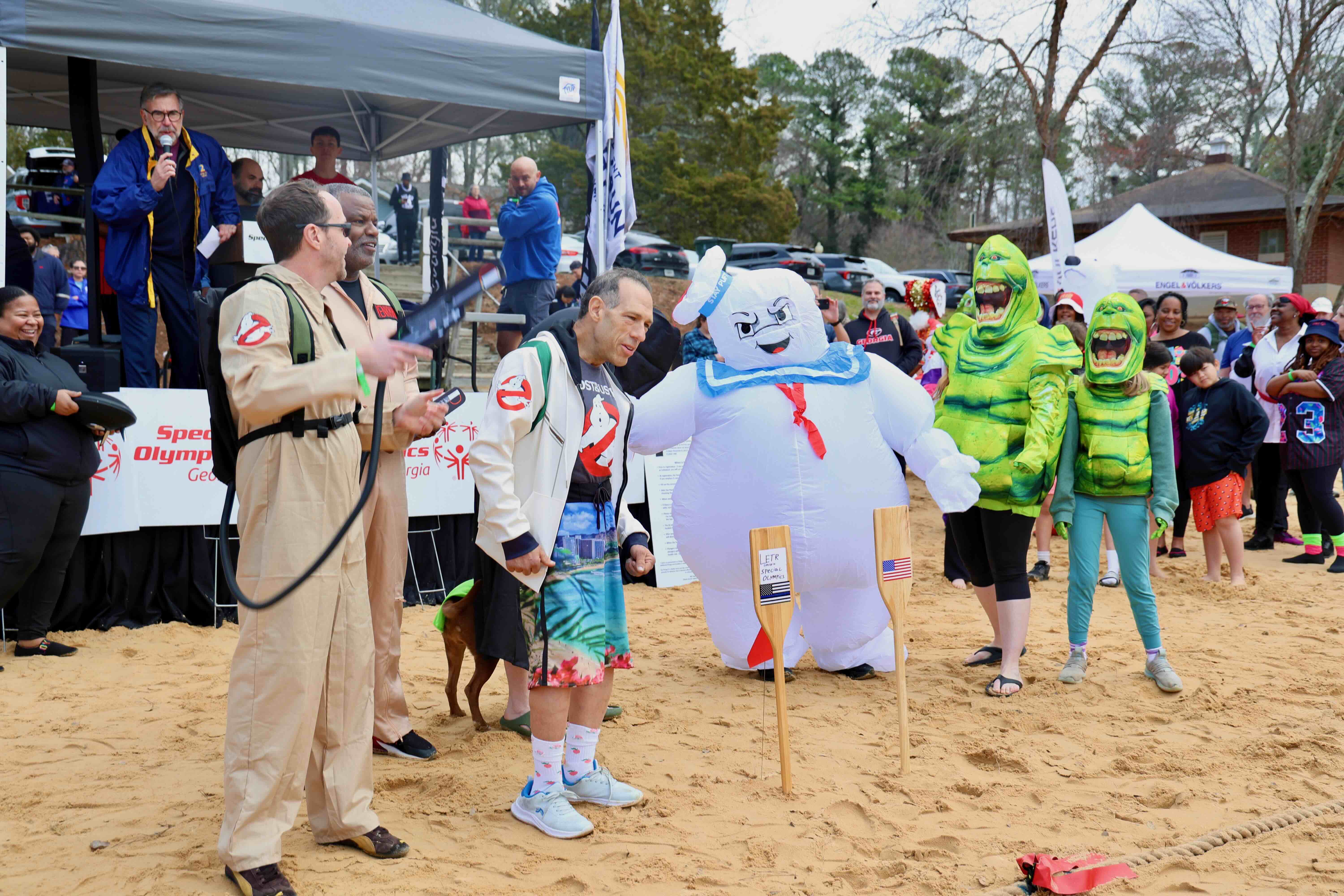 Polar Plunge participants step into the spotlight and show off their awesome Ghostbusters costumes during the 2026 Polar Plunge costume contest.