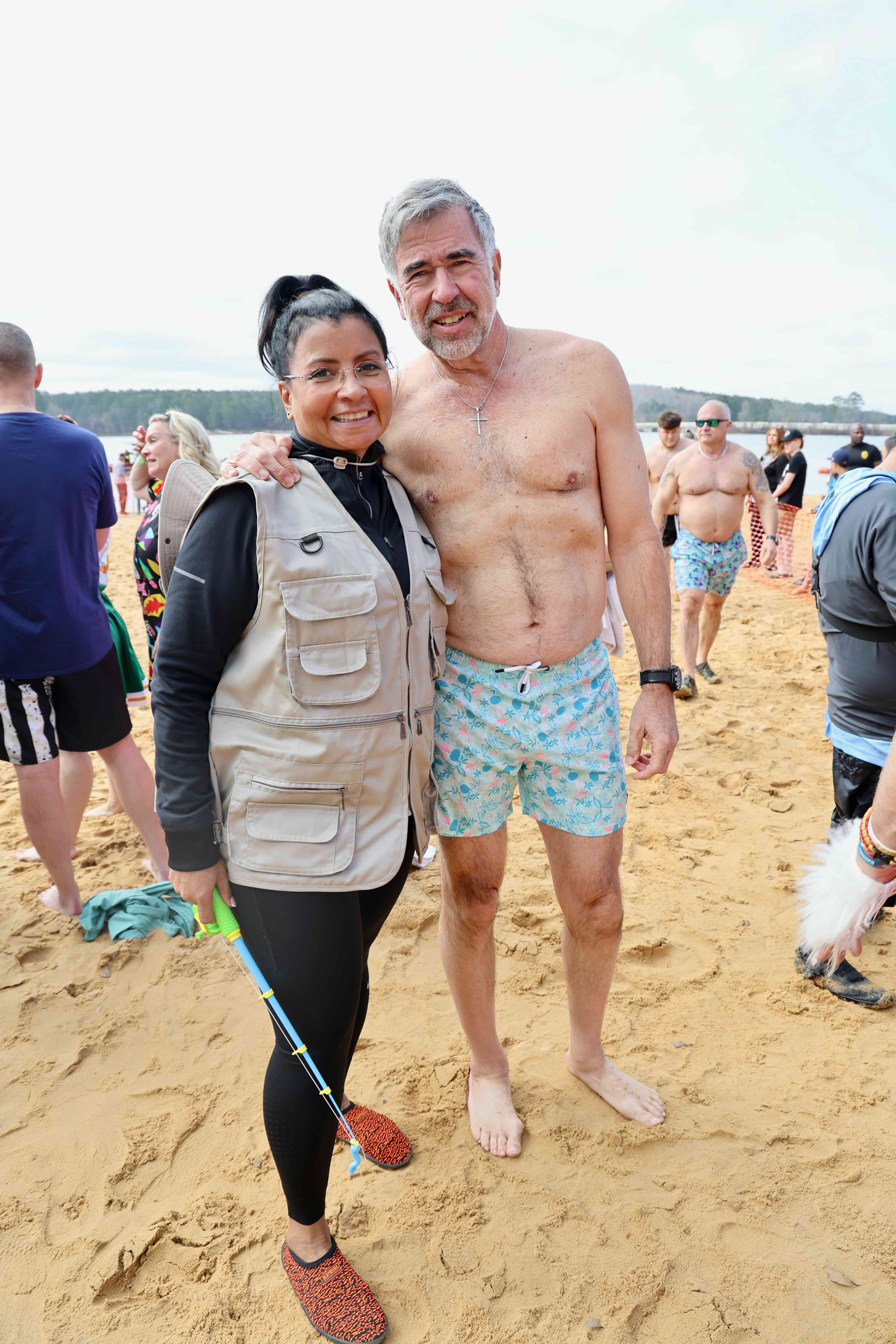 WSB-TV reporter Mark Winne and Asst. Chief Gina V. Hawkins gear up and get ready to take the icy dive at the 2026 Polar Plunge!